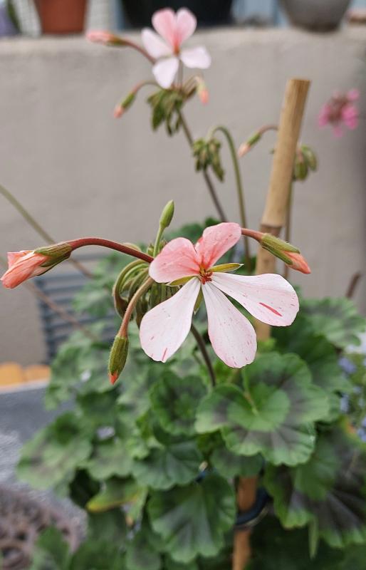 Helle zarte Blüten gehören zum Lavender Lindy, ist eine Hängepelagonie, so wie Reniforme, die etwas dunkle Fliederfabe hat und ganz in Hintergrund zu sehen ist. Die beiden duften sehr zart