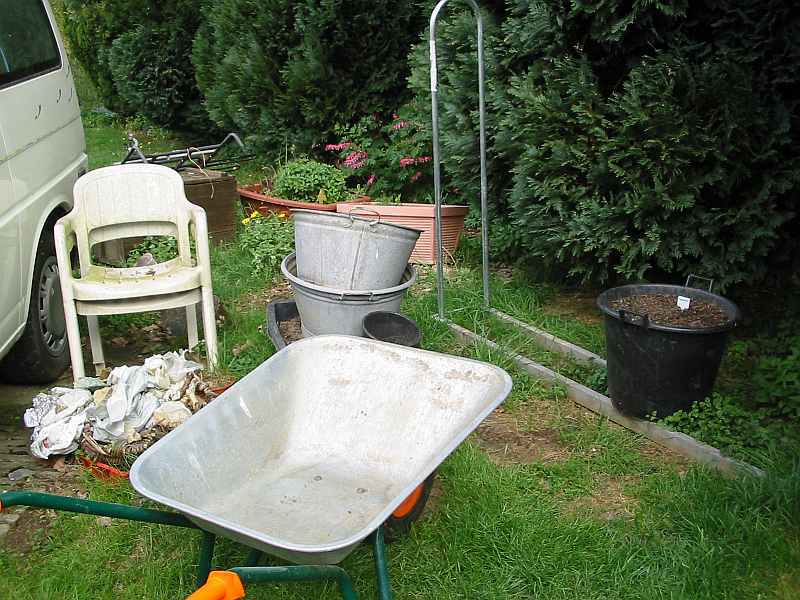 Nix, da, die warten nur noch drauf, von innen mit Schwimmbadfarbe gestrichen zu werden (sind total verrostet und verfärben das Wasser) die kommen unter die Dachrinne vom Gartenhaus-Anbau.Hier unter den Fichten muss ich auch aufräumen, da liegt einiges für den neuen Kürbishügel und die Bohnentipis muß ich auch noch mit Bindfäden bespannen: