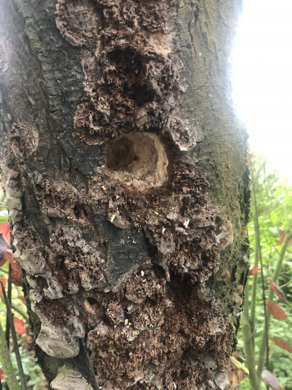 Plant hier ein Specht einen Bau? Es befindet sich in Augenhöhe in einem toten Blutpflaumenstamm.