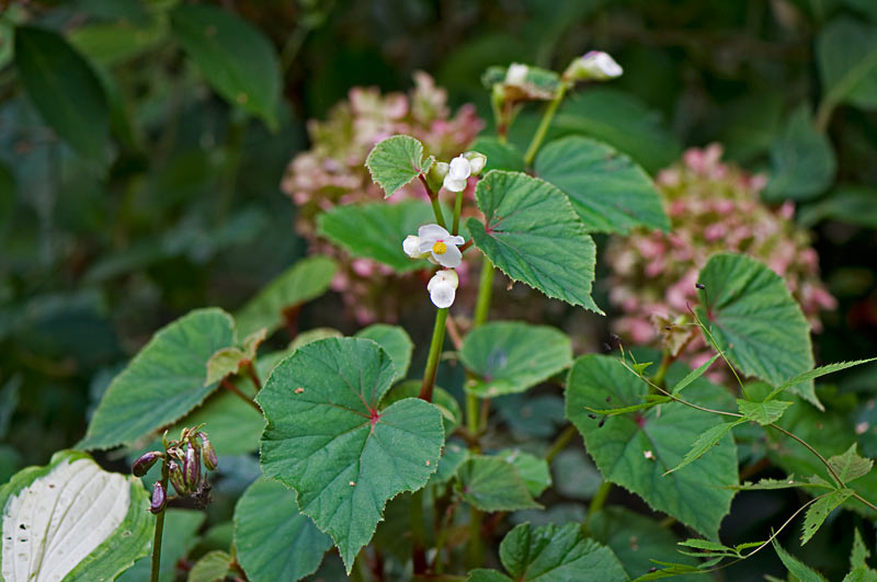 Ist es eine Blattschmuckstaude? Oder eine Schattenstaude? Auf jeden Fall ist die erste Blüte der Begonia grandis ´Alba´ aufgeblüht. Lange, lange hatte sie im Knospenstadium verharrt.