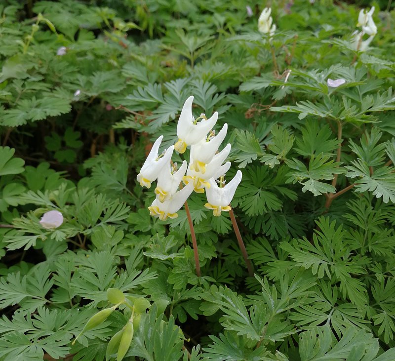 Dicentra canadensis ist bei mir im sandig-humosen boden fast unkraut, bildet mit dem farnartigen laub dichte teppiche + ich kann cornishsnows festellung zum blühverhalten bestätigen...nur selten sieht man mal blüten. Dicentra cucullaria kann ich von canadensis vom laub her nicht unterscheiden, aber es blüht + die blüte finde ich auch schöner als die von canadensis.
