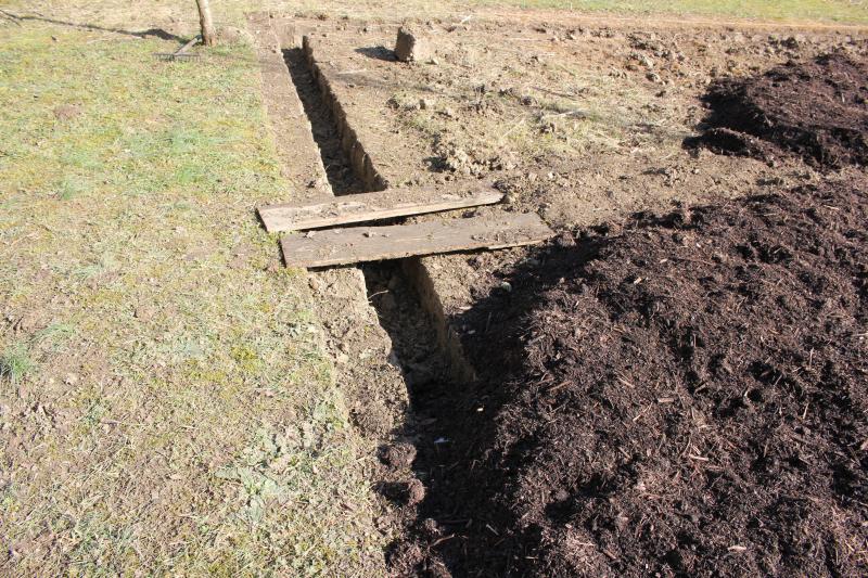 Und hier mal unser "Unkrautgraben" aus der Nähe. Er wird mit Kompost gefüllt, damit von außen einwachsende Wurzelkräuter leicht entfernt werden können. Ob es wirkt? Wir werden sehen: