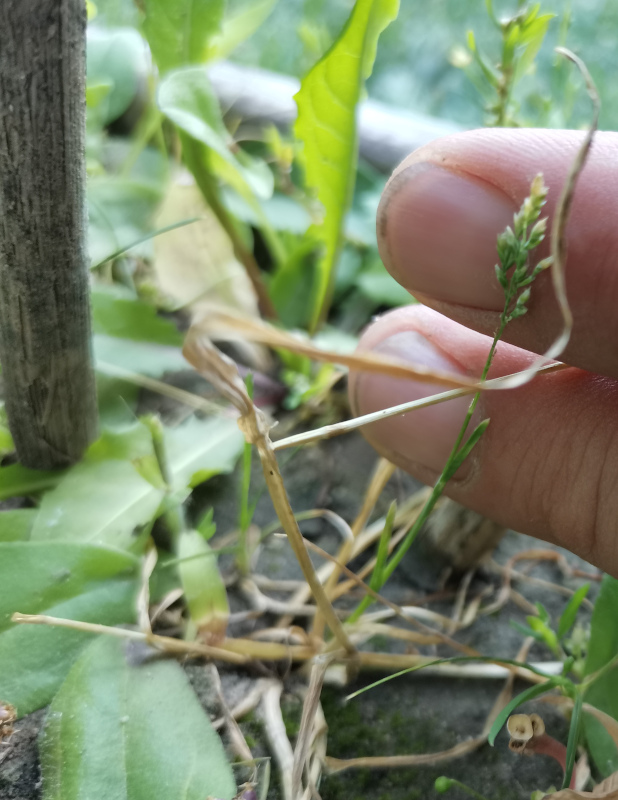 Rispe war schon richtig. Eigentliches Rispengras (Poa) ist möglich, aber mit dem bisschen, was in den Bildern erkennbar ist, nicht zuverlässig zu bestimmen. Schau an dem noch grünen Blatt, ob ein Blatthäutchen vorhanden ist und ob längs der Blattmitte eine "Schiene" erkennbar ist. Die Blattspitze wirkt kahnförmig zusammengezogen, ebenfalls ein Poa-Merkmal. Wenn die Pflanzen nach der Blüte vollständig absterben, kann es Poa annua sein, ein allgemein verbreitetes Gras in ruderalen Flächen.
