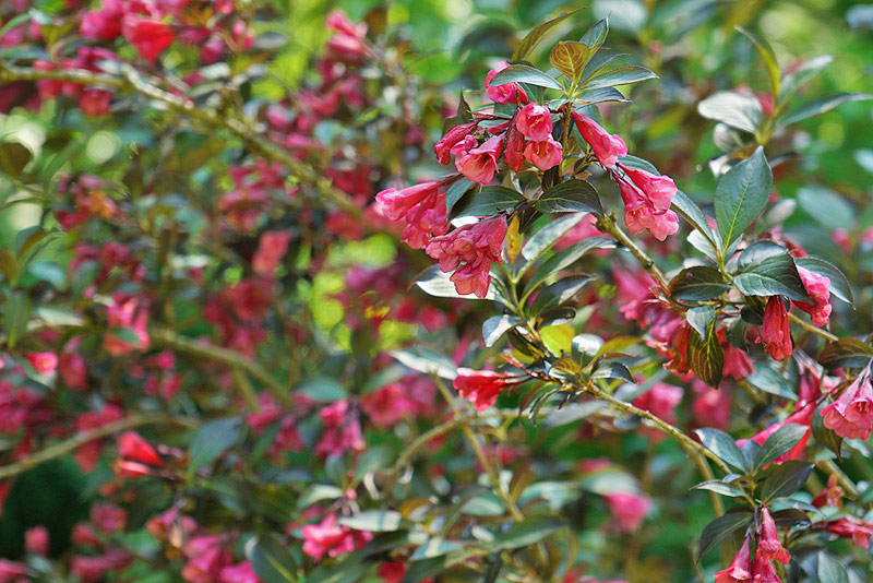 Weigela florida 'Purpurea' blüht wunderbar dicht.