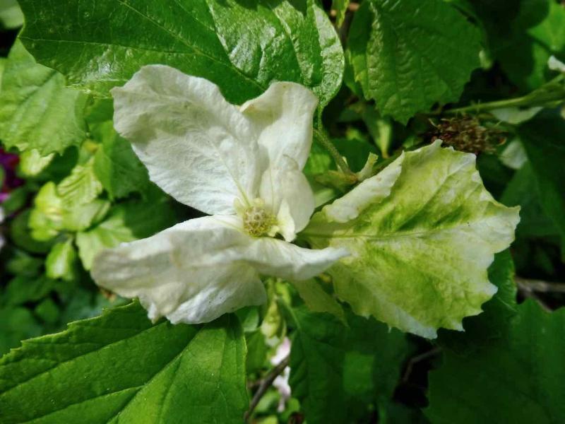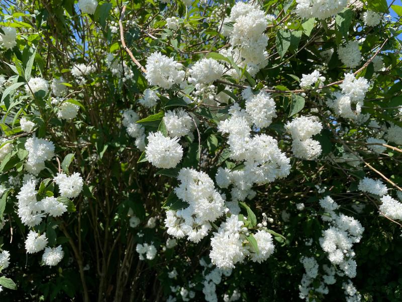 Normalerweise erscheinen die Scheinblüten von Parrotiopsis jaquemontiana vor den Blättern, aber heuer fielen sie dem Spätfrost zum Opfer. Jetzt haben die Blätter ausgetrieben, und es kommen überall Nachblüten an dem gut 4 m hohen Strauch.
