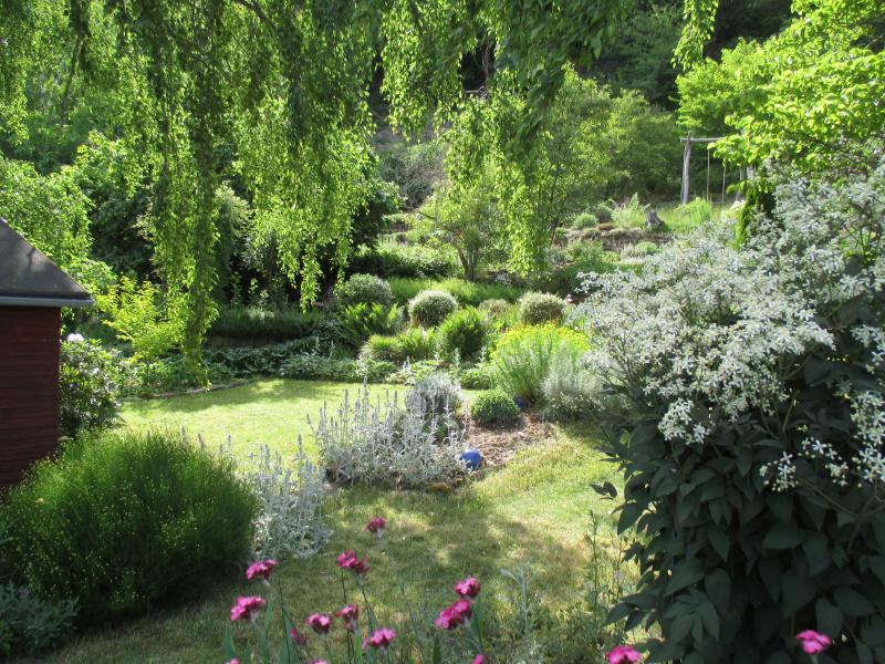 Setzt man sich auf die Bank hat man diesen Blick in den Garten hinauf.