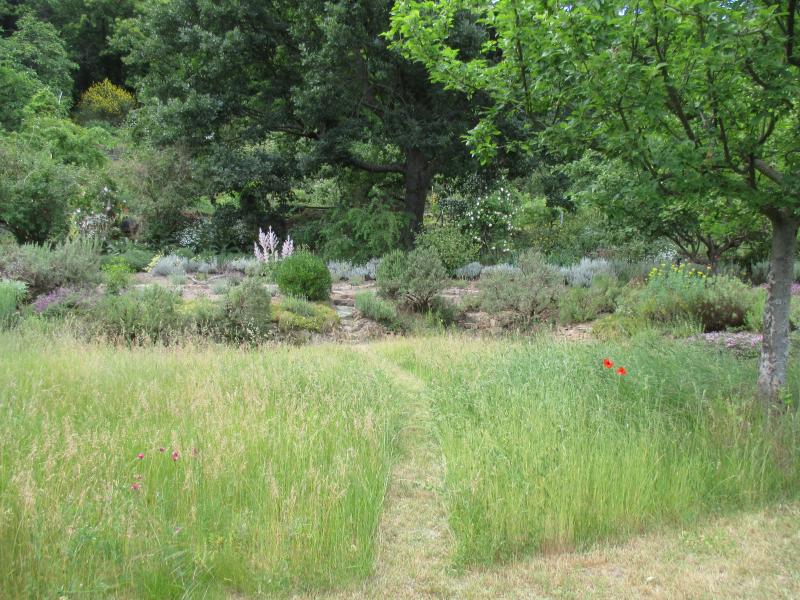 Das Gras auf der Grillwiese habe ich dieses Jahr nur teilweise gemäht. Hier der Blick in Richtung Kräutermauer.