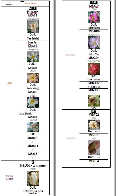 .Ich hab aber im Folgejahr mit MB weitergemacht, hier mal eine Übersicht, links stehen die Vaterrosen, Mutter ist immer MB. Erst kann man lesen wieviele aus den jeweiligen Kreuzungen gekeimt sind, wobei F für Freiland steht, denn die (Fensterbrettler