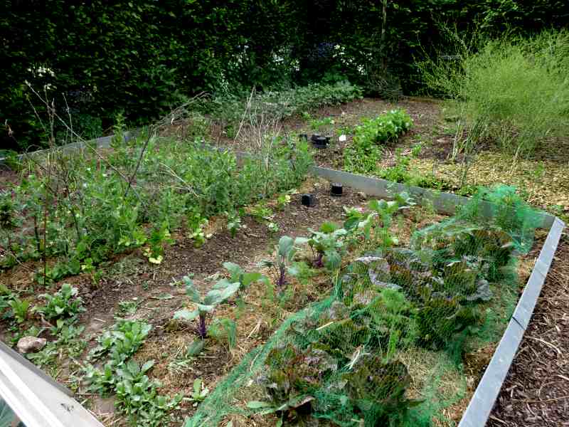 Und noch aus anderer Blickrichtung. Bei mir wachsen übrigens auch Klatschmohn und Ringelblumen dazwischen. Auf der anderen Seite des Weges habe ich noch Kohl, Mangold, Rettiche, Andenbeeren, Zucchini und Gurken, aber die sind noch unscheinbar.