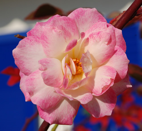 Hier ein nettes Röschen, dass ich soeben im Garten entdeckt hatte. An einem 150 cm hohen einarmigen Trieb. Ich hängte sie über eine andere Rose, um das Blütchen zu fotografieren:
