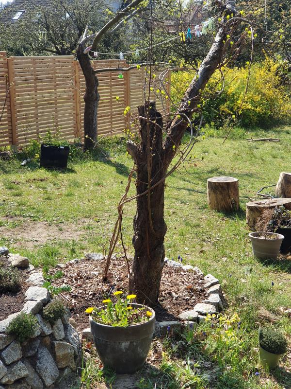 Wie man sieht, einen von den 2 Haupttrieben habe ich heuer völlig gekappt, die hat im Herbst den gesamten Standraum bis zum Zaun zugemacht, da gab es kein Durchkommen mehr. Das ist jetzt nicht der erste Rückschnitt, ich bin da generell nicht sehr zimperlich, aber sie regeneriert sich bislang immer sehr gut.