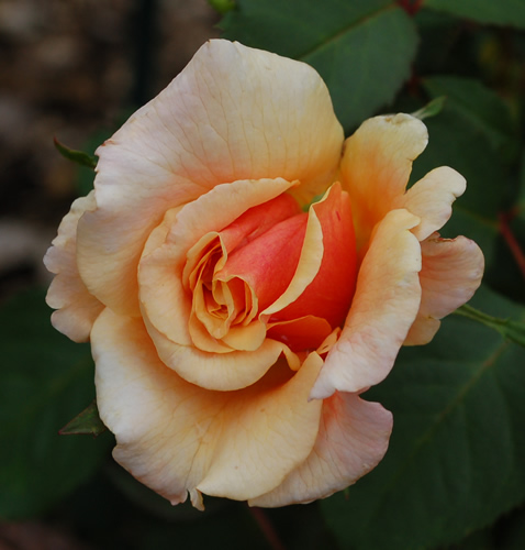 Caramella als sich öffnende Knospe, das Zweifarbenspiel auch an dieser Rose sorgt für Spannung:
