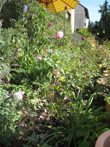 Hier mein Gartendirektor, der sich endlich in die richtige Richtung, sprich Längenwachstum, entwickelt, die Richtung wäre mehr nach 12 Uhr, über die Steine runter. Voller Knospen und etwas Blütchen, gesundes, sattgrünes Laub: