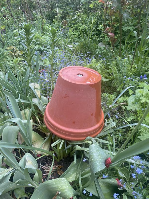 Und wenn mich das verwelkende Laub arg stört ( ist nicht jedes Jahr gleich 😏), dann stülpe ich einen großen Tontopf drüber. Soll man ja eigentlich nicht machen.