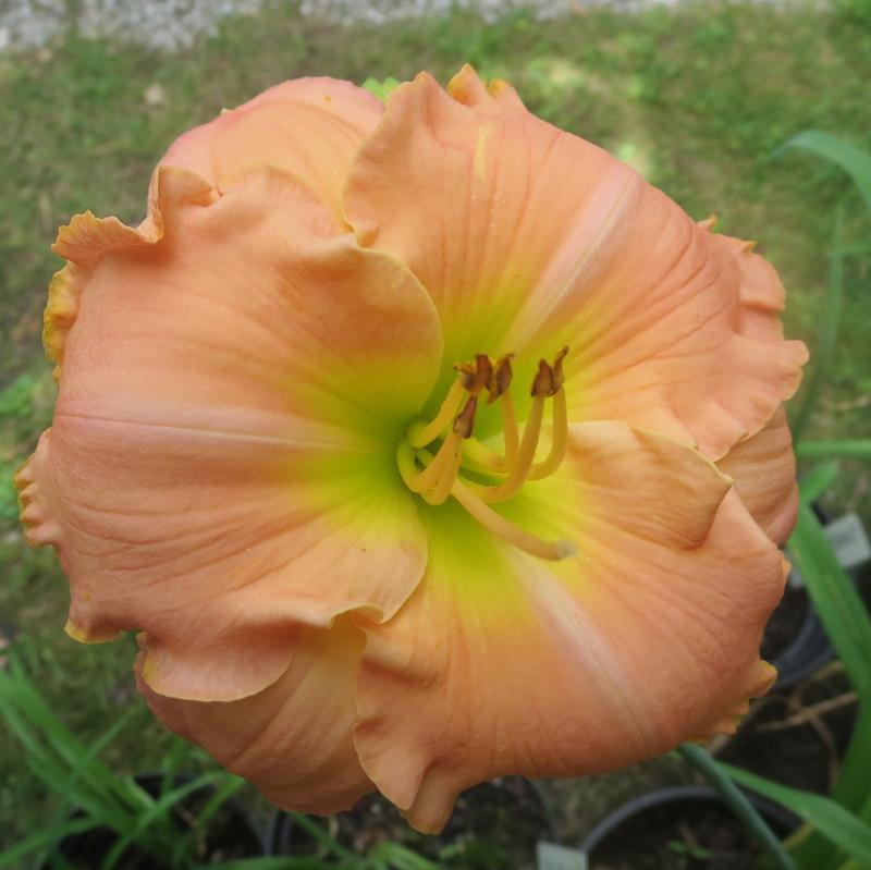 Erste Blüte eines Sämlings von 'Jena Mons'.Sieht der Mama sehr ähnlich, was nicht wundert, weil nur 'Holiday Delight' mit einer ähnlichen Farbgebung in der Nähe steht und ich das Bestäuben den Bienen überlassen hatte.Sie kommt mir etwas schlichter vor, das Auge etwas dunkler, und die Blüte ist trotz Regenwetter und Vormittag gut geöffnet, finde ich zumindest.Mir gefällt sie!Bild