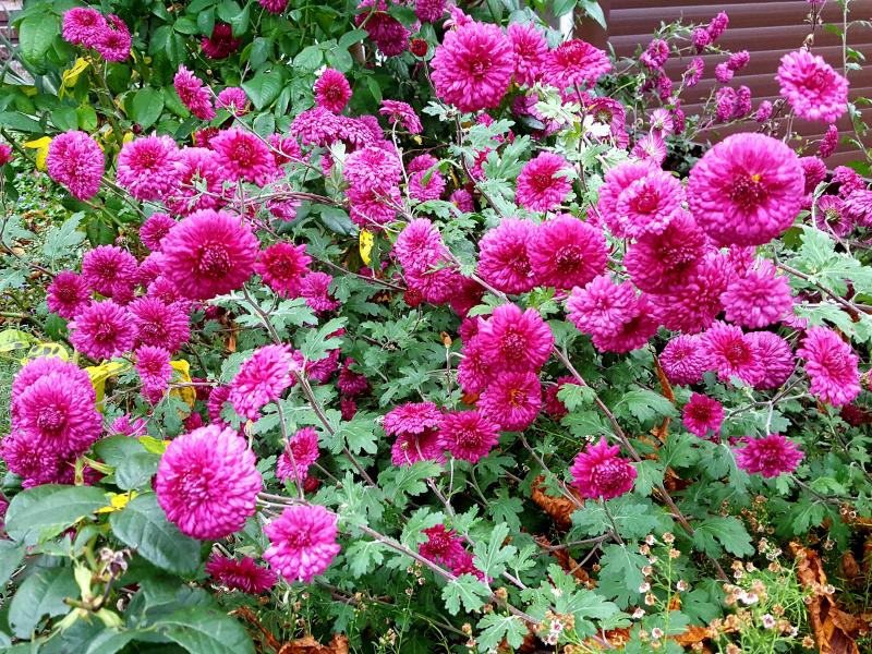 Viele Chrysanthemen blühen noch, andere lassen die Köpfe hängen, einige frühe schon verblüht.