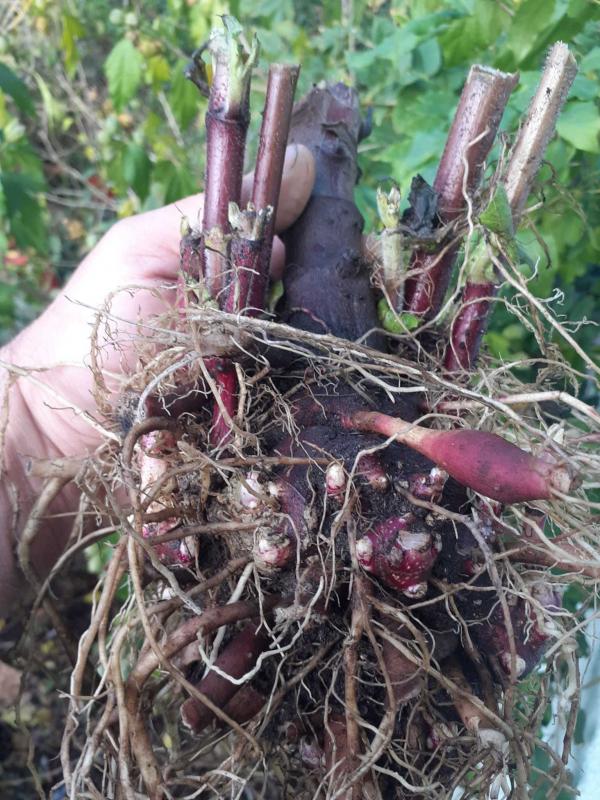 Sie sind draussen. Gute Ernte, gewaschen und geputzt netto etwa 4,3kg Knollen pro Pflanze. War die Sorte "Morado". Die grösste Wurzel hatte >700 Gramm.