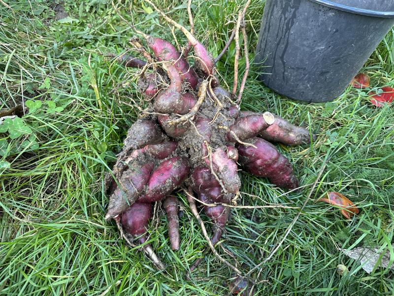 Was mir auffiel, unsere sind direkt nach der Ernte dunkelrot, eher schon auberginefarben. Wenn man's nicht weiß, könnte man sie mit Süßkartoffeln verwechseln.