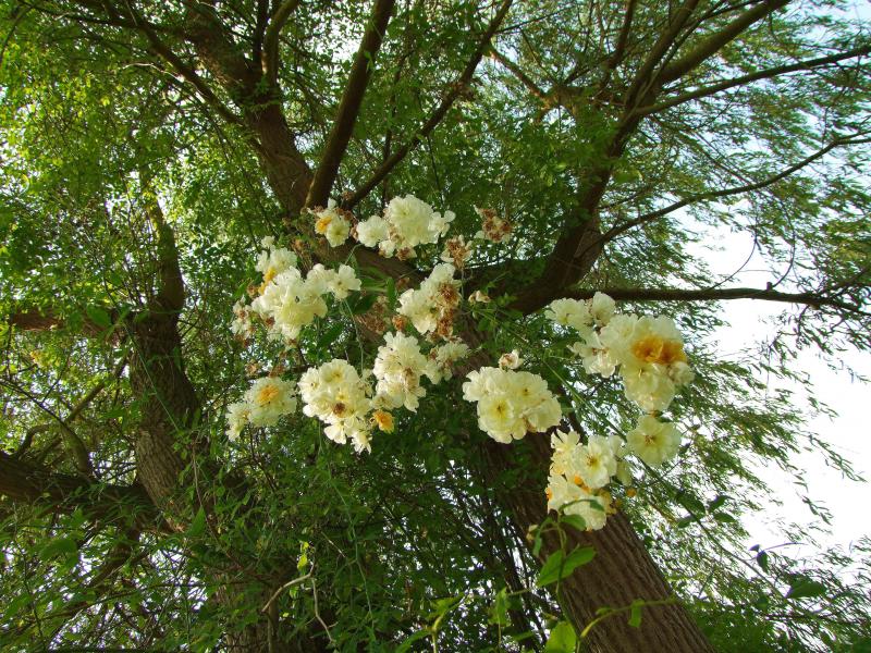 Im Augenblick erfüllt wieder Rosenduft den Garten. Hier will 'Mayor of Casterbridge'hoch hinaus.Sie ist locker 2,50-2,80m hoch.Ich frage mich,warum sie oft immer noch mit 1m angepriesen wird.