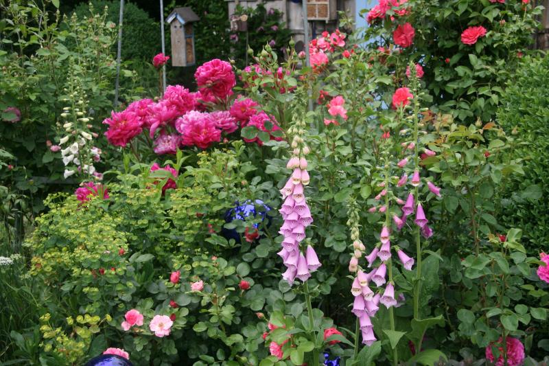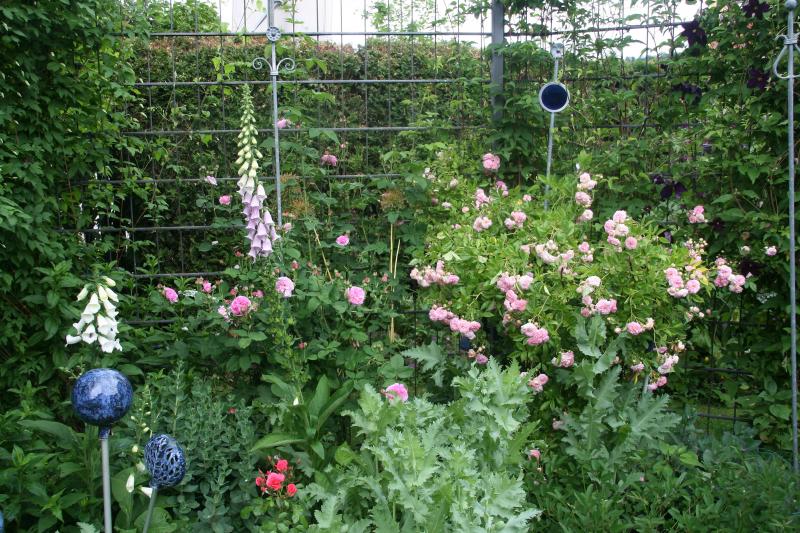 Die rote Rose rechts ist die Out of Rosenheim von Kordes. Die ist heuer so groß geworden, sehr gesund und die Blüten sind so schön. Muß morgen mal eine Nahaufnahme machen.