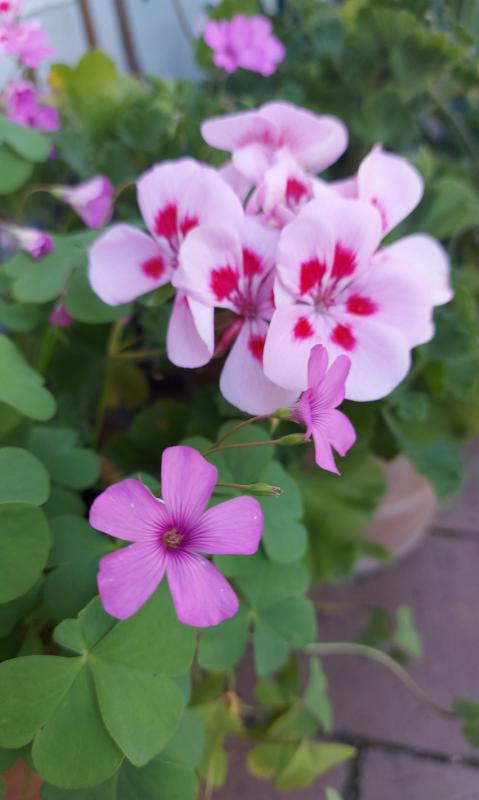 Aus einem italienischen Rasen gestochener Klee ( O. articulata, dort Unkraut) und die vom Müll gerettete Geranie geben gerade ein hübsches Paar ab. Trotz völlig falscher Farbe. ;D
