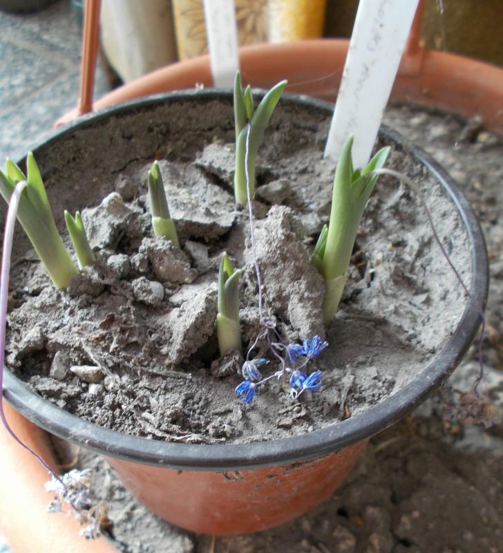 Da schaut man zweieinhalb Monate nicht ins Kübel-Sommerlager auf dem Dachboden und muß dann feststellen, daß Hyacinthoides mauritanica dort klammheimlich und in völliger Trockenheit geblüht hat :-X