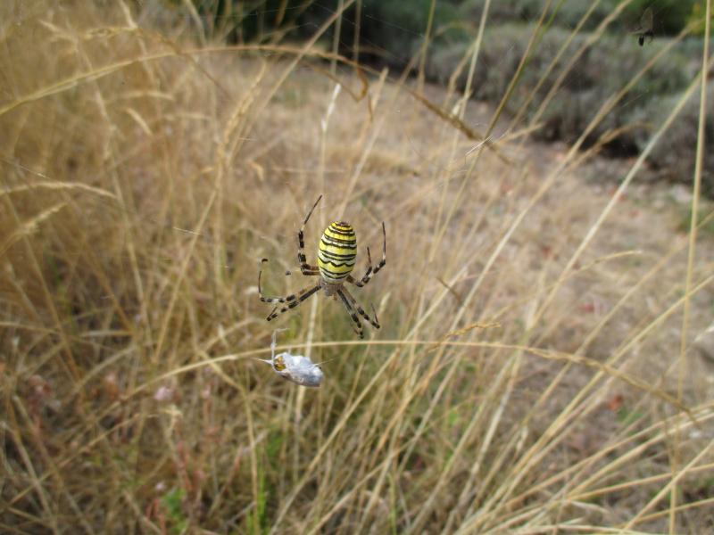 Hier habe ich nach vielen Jahren wieder Wespenspinnen (Argiope bruennichi) gesehen. Sie hatten ihre Netze in einem ungemähten Wiesenstück im Garten gebaut. Eine konnte ich dabei beobachten, wiese sie eine Wespe fachgerecht verpackte. Es erschien mir so als hätte sie ein Netz aus ihren Spinndrüsen über ihr Opfer geworfen.