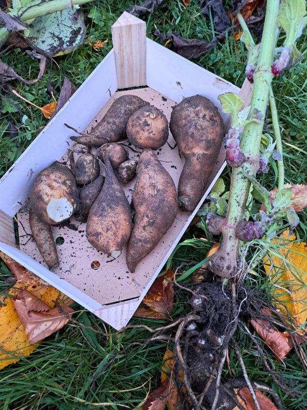 Gestern habe ich noch eine Wurzel gegessen, um nochmal den Geschmack zu testen. Eigentlich lagern sie ja nicht so optimal, weil zu kühl, feucht und dunkel gelagert, aber mein Eindruck ist, daß sie süßer geworden sind. Die Ernte ist jetzt rund einen Monat her.