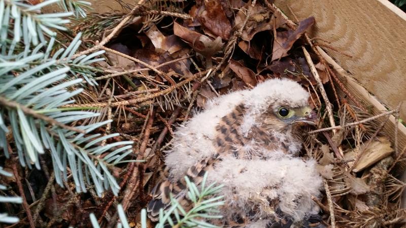 Bei meinen täglichen Rundgängen bemerkte ich unter einem Lorbeerstrauch einen kleinen Federball der wie ein kleiner Kauz aussah, es war einer der drei jungen Turmfalken. Von den beiden Geschwistern war nichts zu sehen.
