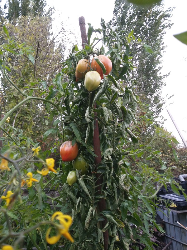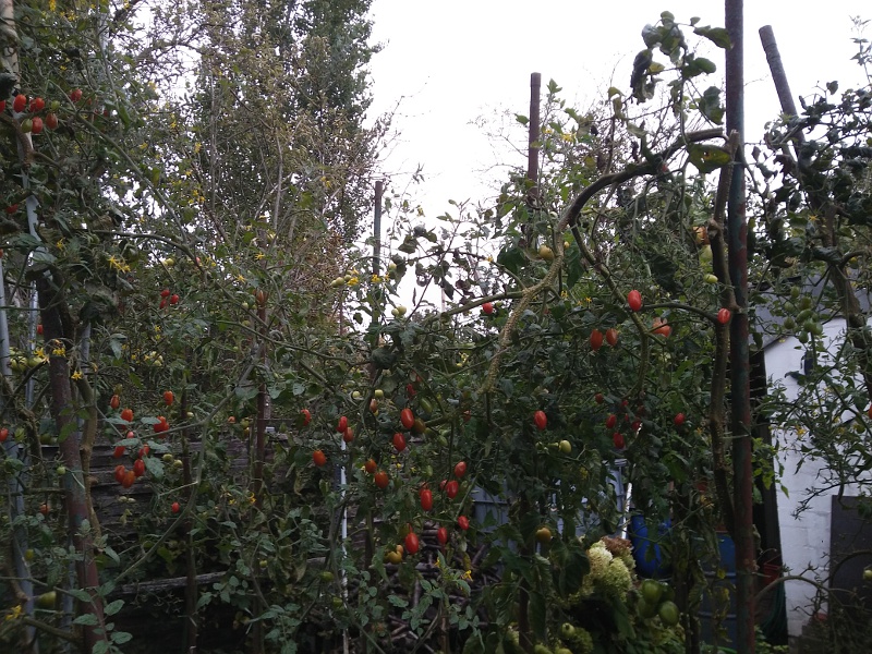 Deswegen habe ich letztes Wochenende im Gewächshaus kurzen Prozess gemacht. Was reif war, habe ich gepflückt, den Rest komplett gerodet. Unter dem Carport stehen die Tomaten noch gut da, die werde ich erst rausschmeißen, wenn es den ersten Frost gibt.