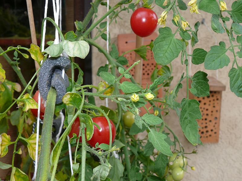 Die Fioline hat es dieses Jahr auf etwa 5m Länge und 15 zu beerntete Rispen geschafft, die Amish Paste (Im Bild mit Blättern) immerhin noch auf gut 4m Länge.