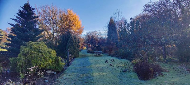 So schön, der "goldene November!" Ich staune, dass Deine Kletterhortensie noch das Laub hat, bei mir ist das schon vor zwei Wochen abgefallen. Es ist auch nie so schön goldgelb, sondern färbt innerhalb weniger Tage fahlgelb und fällt dann ab. Kann natürlich mit der Position zusammenhängen, hier steht sie an der Nordwand und bekommt nur am Morgen ein klein wenig Sonne ab. Der Fächerahorn ist einfach umwerfend, wahrhaft ein Traum! :D Ich habe mir fest vorgenommen, auch noch einen oder zwei in den Halbschatten zu pflanzen, die wachsen ja zum Glück langsam und gewinnen erst nach einigen Jahren so richtig Format.