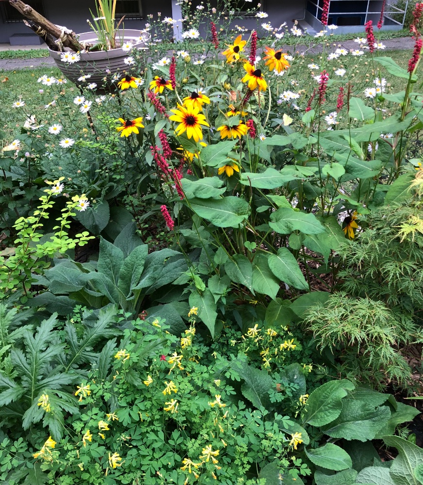 Dem Kerzenknöterich haben die Regenfälle wohl auch gefallen, er hat dieses Jahr deutlich zugelegt, aber immerhin, er ist hart im Nehmen und war sogar in den vergangenen Dürrejahren ein Garant für eine schöne Blüte bis zum ersten Frost (der hier meist erst Mitte November eintritt). Die putzigen kleinen Goldruten davor sind wohl Sämlinge, denen vor ein paar Wochen ein "Chelsea Chop" mit dem Rasenmäher zuteil wurde, interessant, dass sie jetzt so zahm und in verträglicher Höhe blühen wollen. Passend dazu ist auch Rudbeckie triloba hier nicht höher geworden - wenn sich so etwas doch nur planen ließe!