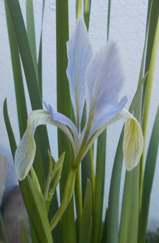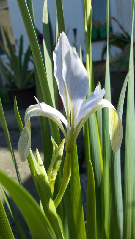 Vor vielen Jahren hab ich eine größere Menge weiß blühende Iris x hollandica gepflanzt. Der Standort im Hof scheint ihnen zuzusagen, sie sind alle Jahre wiedergekommen, ohne dass ich sie ausgegraben hätte. Und sie haben immer geblüht: ausschließlich weiß. In diesem Jahr schau ich aus dem Fenster und bin irritiert: Wieso in aller Welt steht da eine Iris x hollandica und blüht BLAU?!