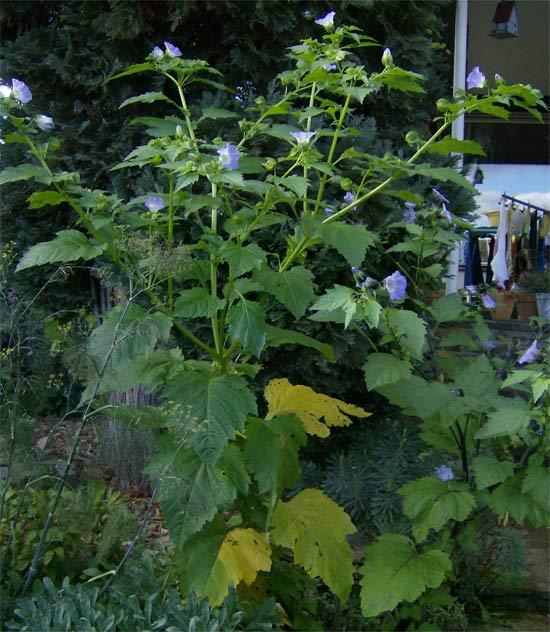 Diese Nicandra physalodes hat sich innerhalb von weniger als drei Monaten zu einem fast 3 Meter hohen Monster entwickelt.Dieser Teil des Beetes wurde erst im Juli (nach der großen Hitze) neu gestaltet, im zugefügten Komposthumus ist dann der zufällig enthaltene Nicandra-Samen gekeimt.