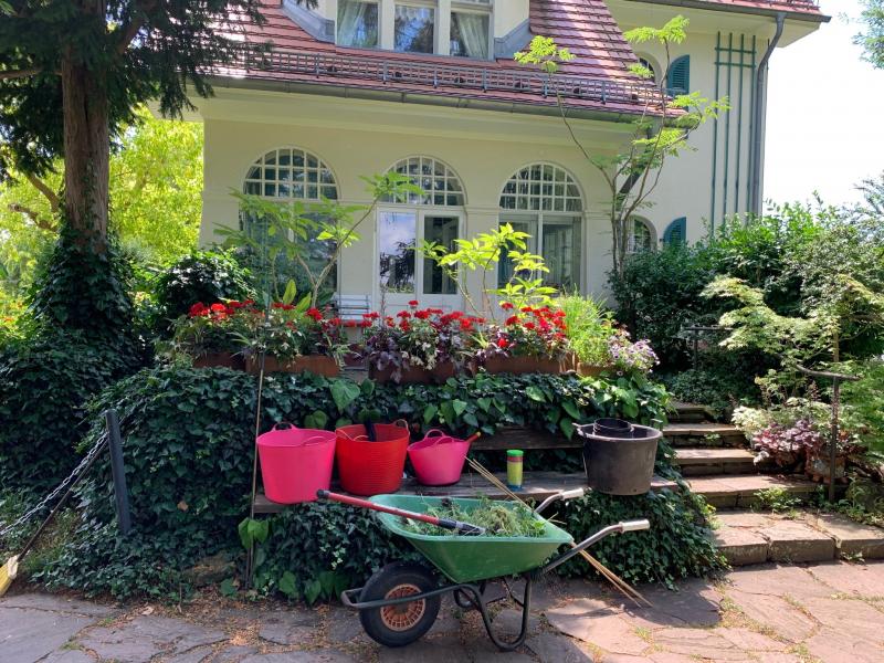 Das Werkzeug wird gestellt und nach getaner Arbeit gab es Kaffee, Tee und Kekse im Privatgarten. Heute waren Dr. Conrad Näser und seine Frau gekommen, um ihr neues Buch vorzustellen, zu verkaufen und zu signieren. Das habe ich jetzt nicht fotografiert. Dafür gibt es ein paar Bilder aus dem Senkgarten.