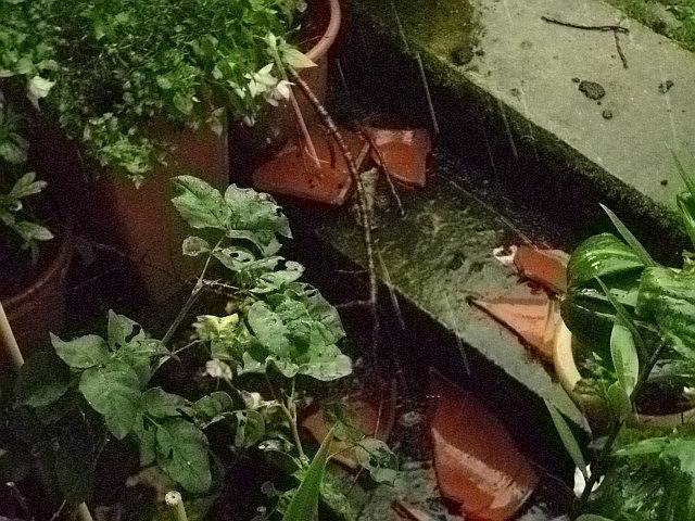 nach ganzer nacht regen hat eben für eine stunde die sonne geschienen, jetzt zieht es wieder zu. 19°gestern im unwetter noch wirklich glück gehabt. ein paar töpfe sind allerdings kaputt.