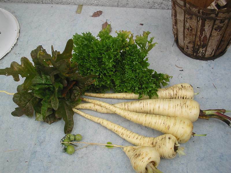 Und dann hab ich nochmal ein paar Pastinaken ausgegraben und Salat (Multy und so eine Art Teufelszunge) reingeholt: