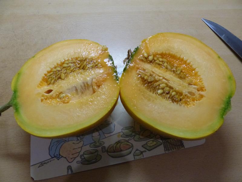 Du hast mit Sicherheit mehr Erfahrung im Melonenanbau als ich und kannst den Reifezeitpunkt deiner Melonen gut abschätzen. Ich möchte nur meine Erfahrung ergänzen, dass ZU reif geerntete Zuckermelonen einfach ekelhaft sind. Folgendes Exemplar musste ich leider entsorgen, da ungenießbar: (komplizierend kam hier dazu, dass die Melone an einer absterbenden Pflanze reifte)