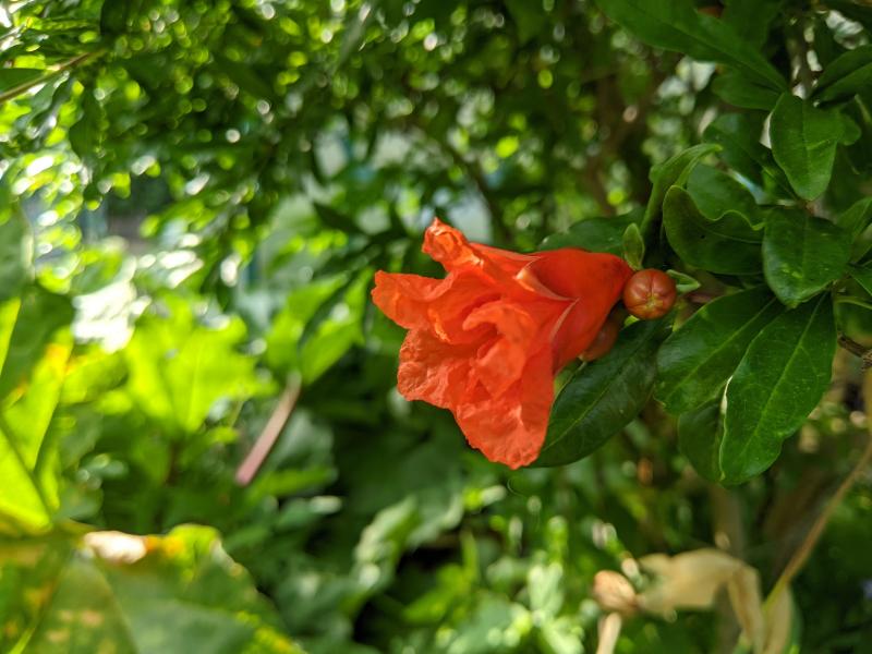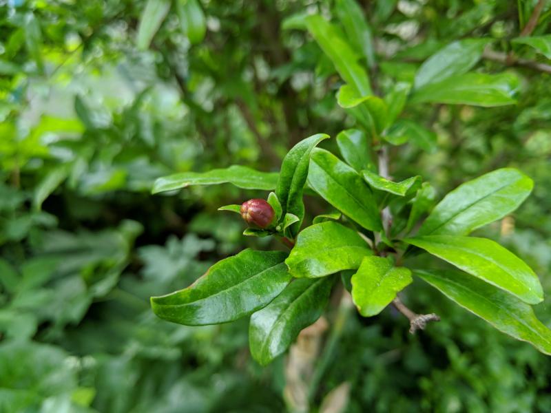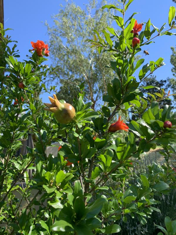 Bei meinem sind die Blüten alle irgendwie versteckt, aber wenn man die Zweige ein wenig anhebt sieht man, dass es dieses Jahr echt viele sind. Jedes Mal wenn ich im Garten bin schnapp ich mir einen Pinsel und versuche sie zu bestäuben, in der Hoffnung dass ich dieses Jahr vielleicht meinen ersten Granatapfel ernten kann.
