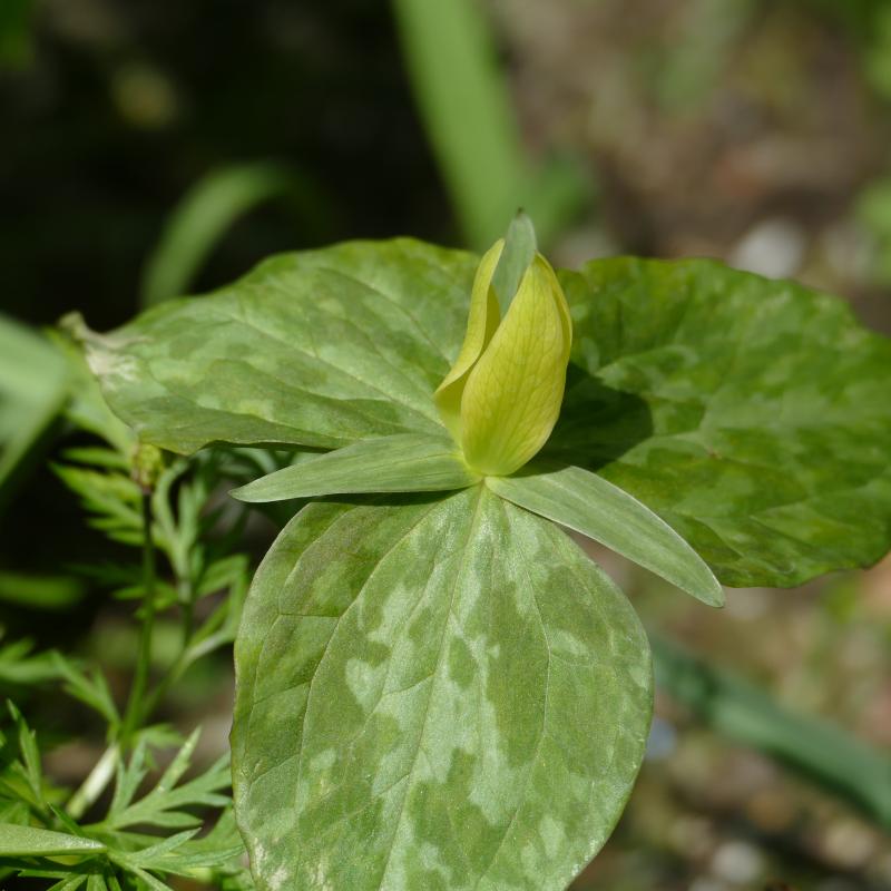 Jetzt endlich vor 4 Tagen die allererste Blüte vom Trillium, gelb mit gefleckten Blättern.