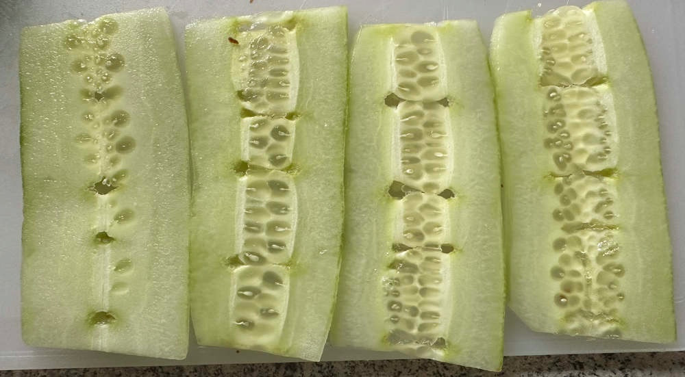 Tanja hab ich schon lange nicht mehr, aber lange tragende Gurken genug. Hailar hat wie alle asiatischen Sorten für meine Maßstäbe wenig Salatgurkenaroma und ein etwas knackigeres Fruchtfleisch, das je nach Verwendung Vor- oder Nachteile mit sich bringt. Die Schale ist mir zu dick und kräftig. Wer sowieso gründlich schält, den wird das nicht stören, mich aber schon. Und schliesslich mag sie nicht so recht im heissen Gewächsaus, es ist wirklich eine Freilandsorte, ich bevorzuge Sorten die in beidem gut sind. Hailar ist sicher keine schlechte Sorte, aber das Licht hat halt auch Schatten, wie eigentlich alles. Tokiwa hat im Gewächshaus übrigens auch Probleme, auch junge Gurken bekommen Hohlräume im Inneren mit Verhärtungen drumrum. So sieht das aus, nachdem man sie in Scheiben geschnitten hat:Der Buddler hat geschrieben: ↑25. Jul 2025, 16:17 Kann ich so überhaupt gar nicht bestätigen. Hailar trägt bei mir bis Oktober, bei Tanja war regelmäßig im August Schluss.