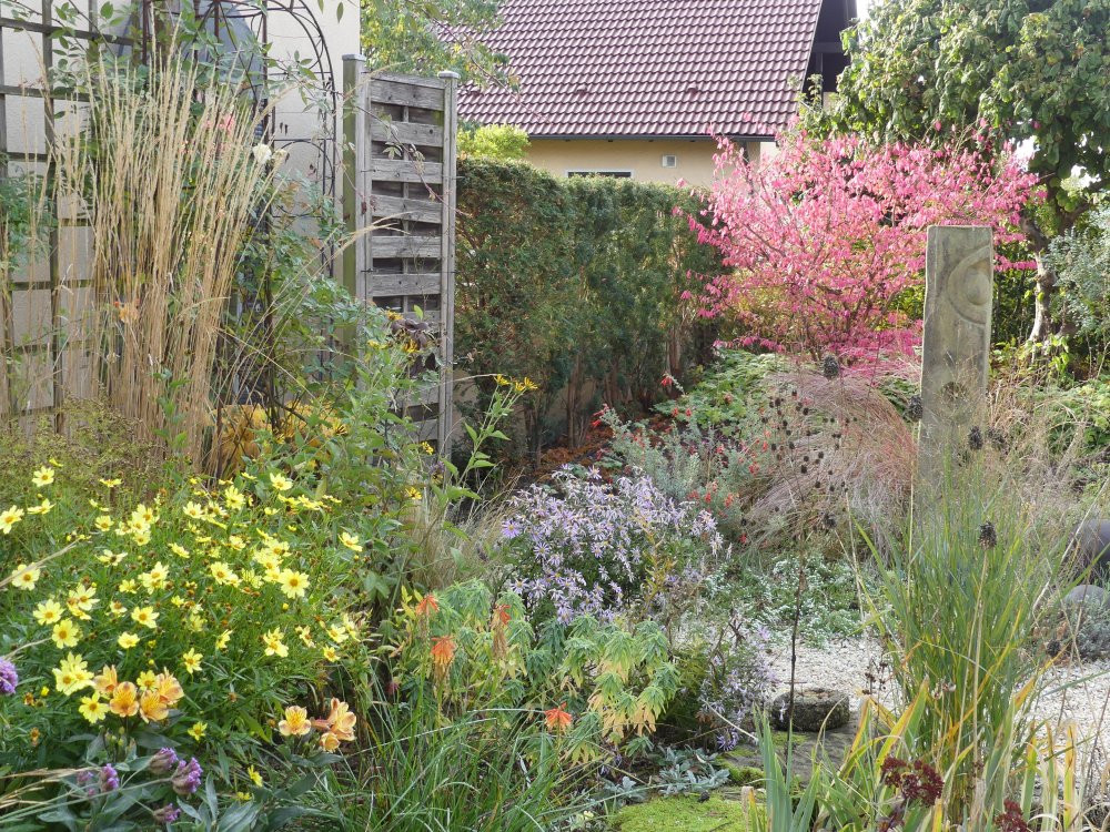Chrysanthemen lümmeln sich hier aber on top auf anderen ( zum großen Teil verblühten ) Stauden, was sie zumindest vom feuchten