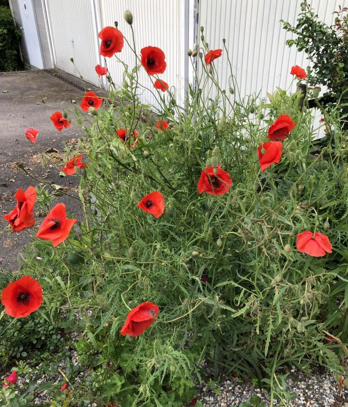 Vor zwei Jahre habe ich von unseren roten Damm die Samen gesammelt und gleich ausgesät. Damals ist nichts gekommen. Ich denke, die Schnecken haben kleine Sämlinge weggefressen. Dieses Jahr habe ich an zwei nicht weit (ca. 10 und 15 m) Stellen den Mohn. Und die Pflanzen sind gewaltig groß. Und weil sie dort nicht eingeplant waren, haben die Pflanzen unter sich begraben. Heute habe ich mit Staudenstützen gestützt.