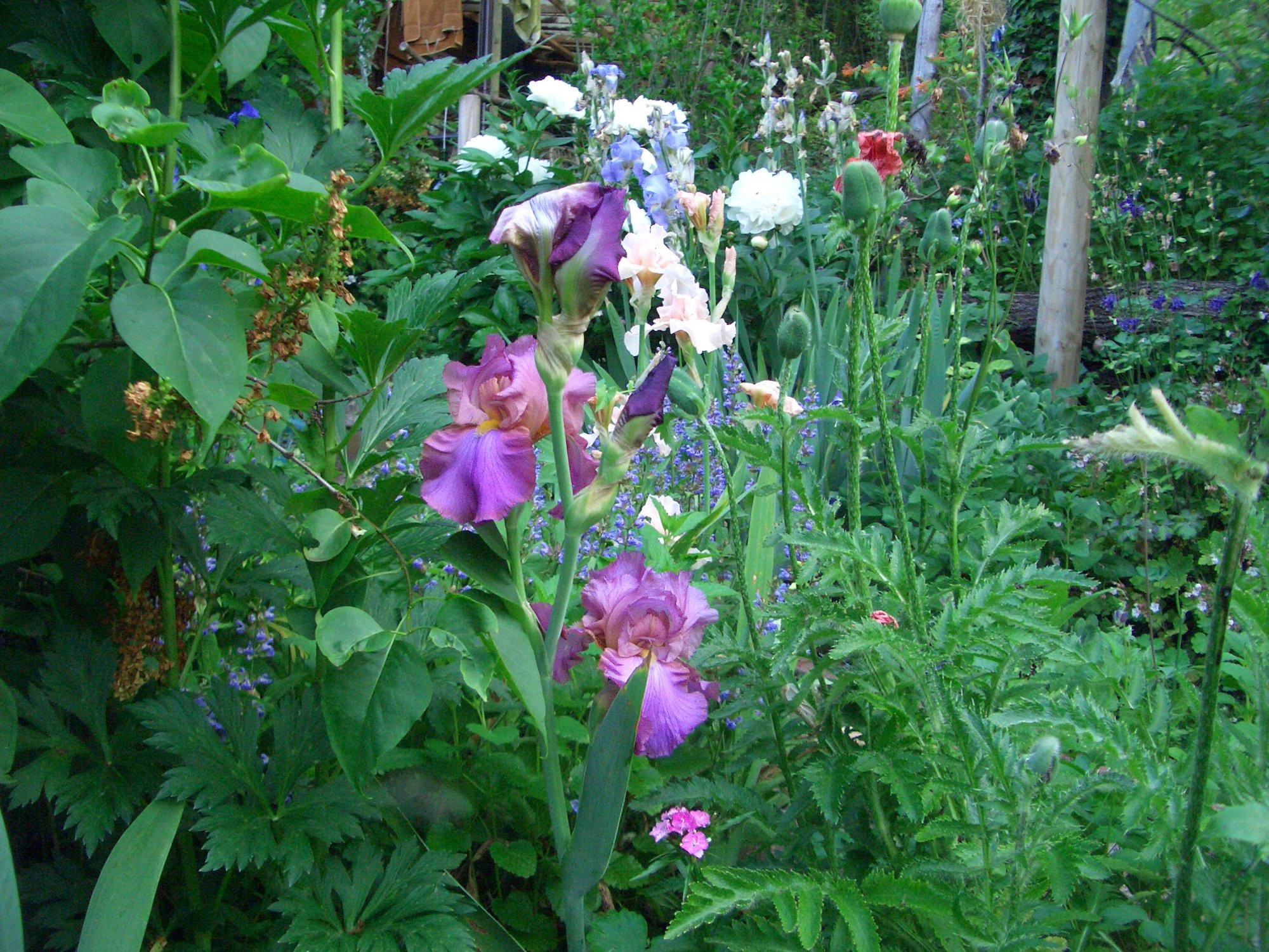 `After Dark´ sein, hier immer wieder mal ein Umfaller, aber andererseits ein so reicher Blüher, das eben mancher Stiel nur seitwärts Platz findet. Bei den beiden mittleren Blüten scheint ein weißer Strich unterm Bart aufzublitzen, das hat die Sorte auch.