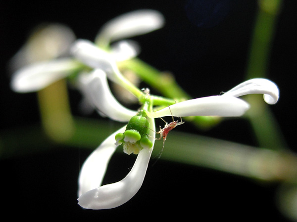 kennt ihr die Euphorbia ´Diamond Frost´? sie wird seit vorigem Jahr als Sommerblume verkauft, obwohl es offenbar eine - allerdings nicht winterharte - Staude ist. Ich habe eine Pflanze bisher erfolgreich über den Winter bekommen, sie hat seither ununterbrochen geblüht mit winzigen Blütchen wie kleine Schneeflöckchen oder Frostkristalle. Hier ein Blütchen mit Laus