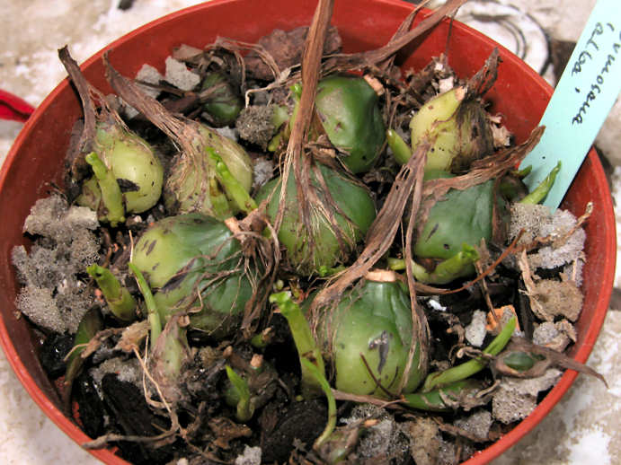 Durchsichtige Töpfe habe ich auch nicht, aber ich pflanze die Bulben recht flach, da kann man die Wurzelbildung auch von oben sehen ohne die Bulben aus dem Substrat zu nehmen (das wäre sicher nicht förderlich, da hast Du recht). Wie man bei tief eingepflanzen Bulben, die keine Blüten treiben den optimalen Zeitpunkt erkennt weiß ich dann leider auch nicht - ich würde bei beginnendem Blattaustrieb das Substrat leicht befeuchten, vielleicht eher Wasser an den Topfrand und zwischen die Bulben gießen, so daß die Bulben und Triebknospen nicht nass werden - dann wird es schon klappen. Hängt halt sicher auch vom Substrat ab, ich habe sehr durchlässiges, hs. aus Rinde, Perlit und Seramis - da hatte ich noch keine Probleme mit Fäulnis.
