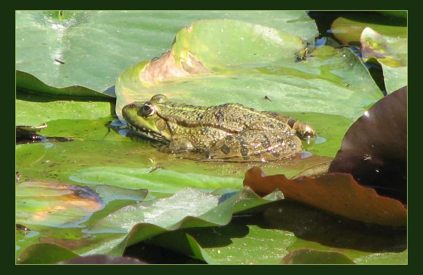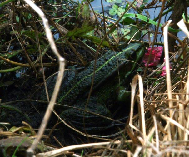 An unserem Teich wohnt ein Teichfrosch. Er ist sehr scheu und ich kann mich ihm nur langsam kriechend nähern. Er sprang mindestens 10 mal ins Wasser bis ihn entdeckt hatte und dann dauerte es noch mal 4 Tage bis mir endlich ein Bild gelang auf dem auch was zu erkennen war.