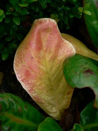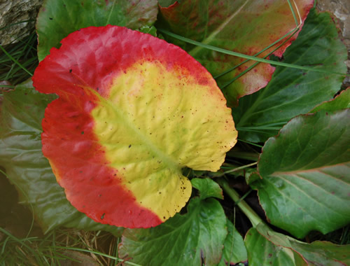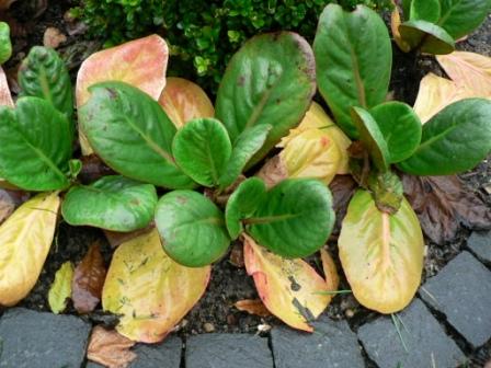 Unbekannte Bergenie. Das Blatt lag halb versteckt unter den grünen Blätter, der abgedeckte Teil ist gelb.