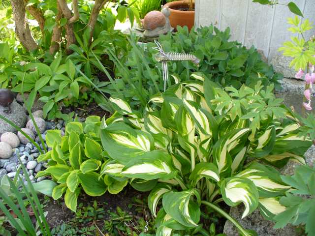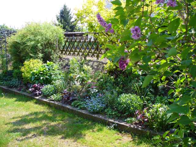 linksseitig vom Gartenhaus hat's eine Rabatte mit Sprudelstein und Funkien (bis jetzt Schneckensicher)